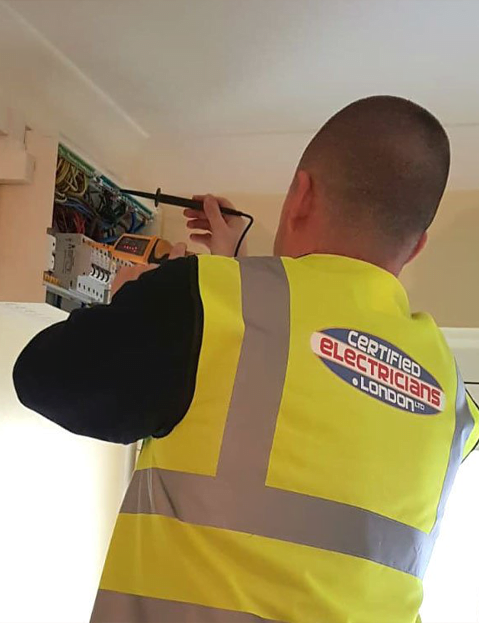 Electrician testing household consumer unit and wiring in electrical fuse box